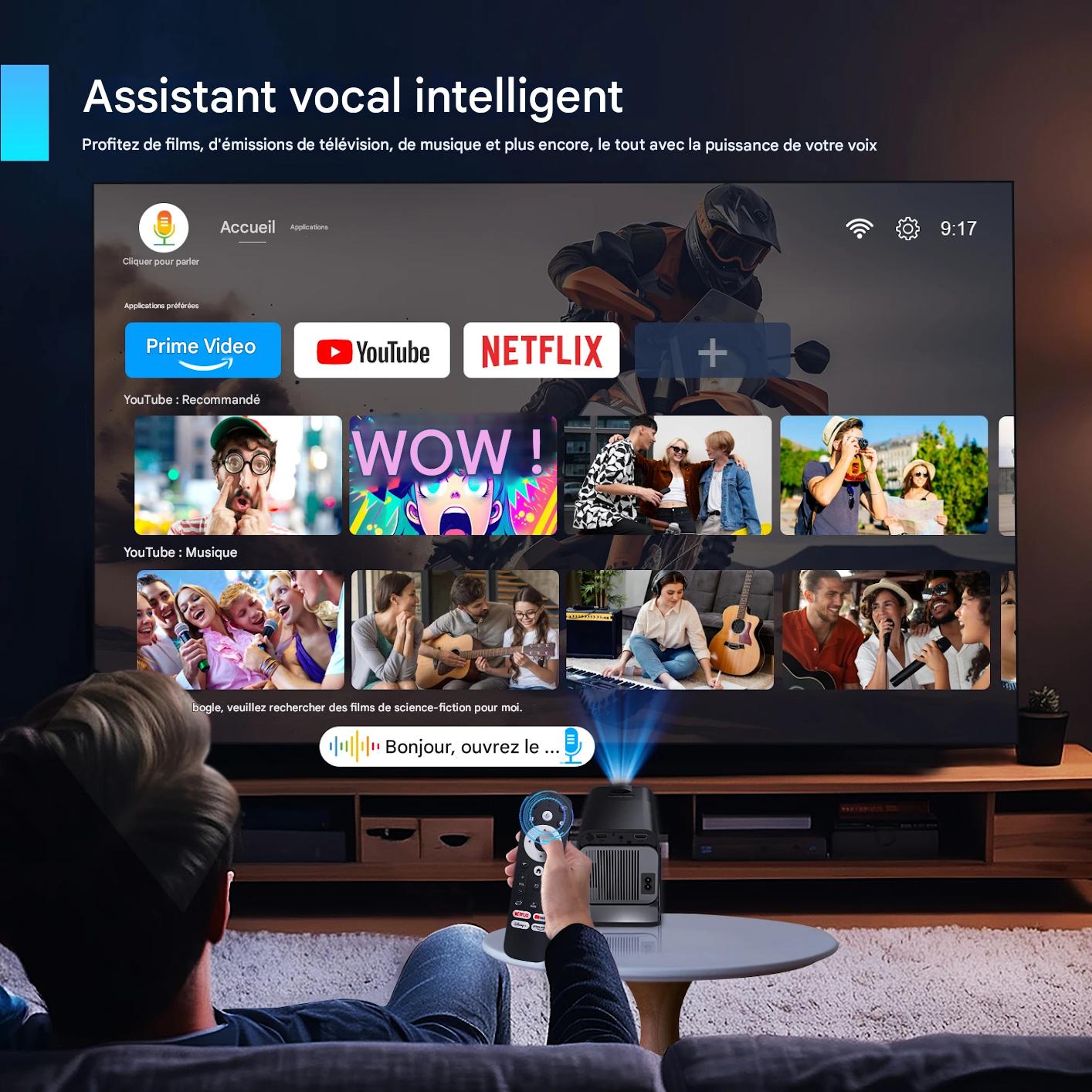 Oui ! Le projecteur intègre les applications Netflix, YouTube, Canal+ et bien d’autres. Il te suffit de te connecter au Wi-Fi pour commencer à regarder.